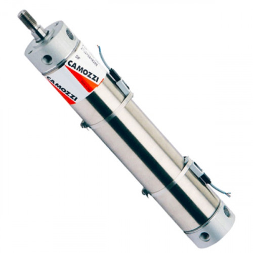 Pneumatic air cylinder constructed using stainless steel for both the tube and the rod and aluminium for the end-blocks.
